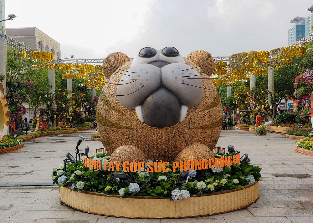 Chú Hổ đất đầu hổ cao 1,82m, đường kính 2,2m đặt ở trung tâm đường hoa Nguyễn Huệ là biểu tượng thuộc chương trình “Chung tay góp sức phòng, chống dịch COVID-19”.
