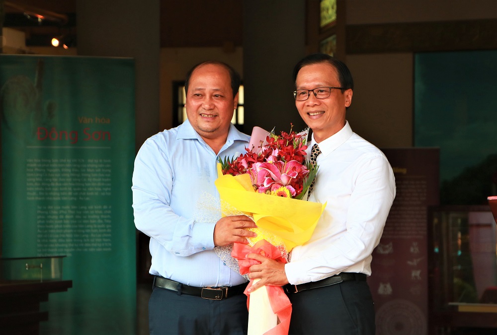 Ông Lê Tấn An - Phó Trưởng ban Quản lý Công viên Lịch sử - Văn hóa Dân tộc TP.HCM tặng hoa lưu niệm ông Hoàng Anh Tuấn – Giám đốc Bảo tàng Lịch sử TP.HCM tại buổi lễ.