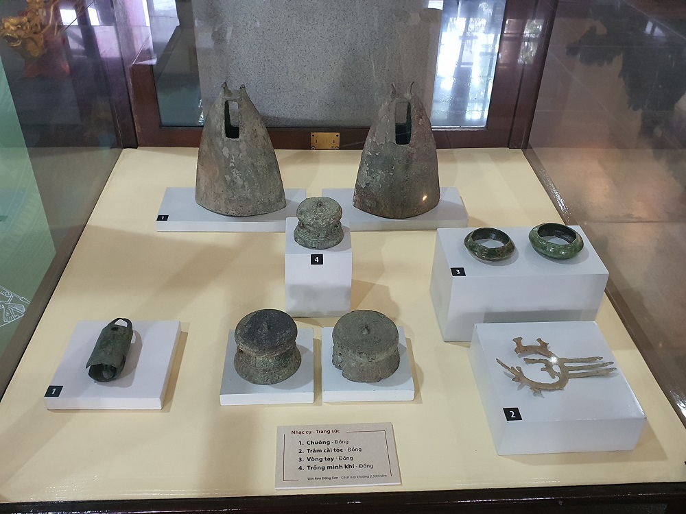 Hiện vật trưng bày - Nhạc cụ, trang sức bao gồm: Trăm cài tóc, chuông, vòng tay, chống minh khí đều được chế tác bằng đồng.