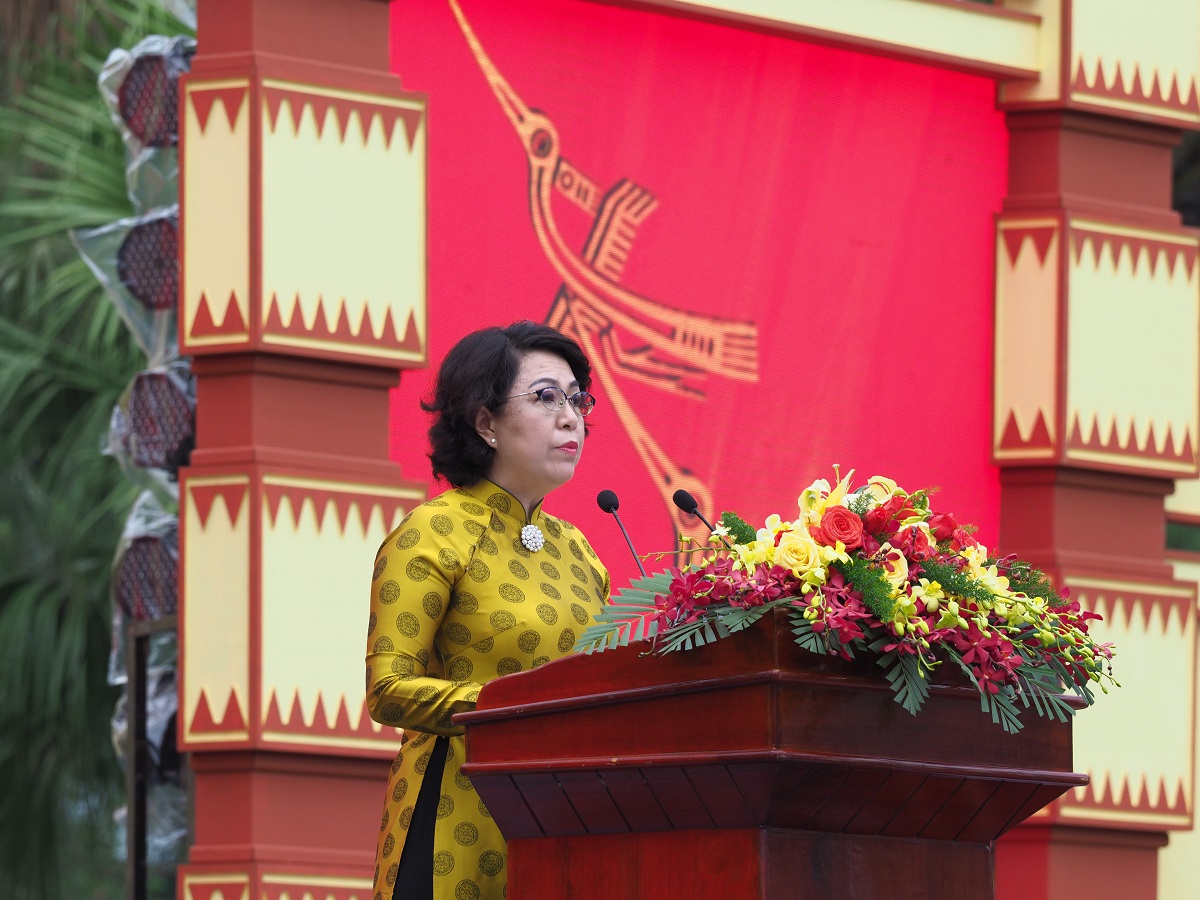 Đ/c Tô Thị Bích Châu - Ủy viên thường vụ Thành ủy, Chủ tịch UBMTTQ Việt Nam TP.HCM đã đọc diễn văn ghi nhớ công ơn Quốc tổ Hùng Vương - Ảnh: Trung Anh.