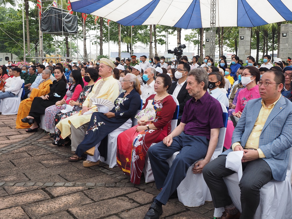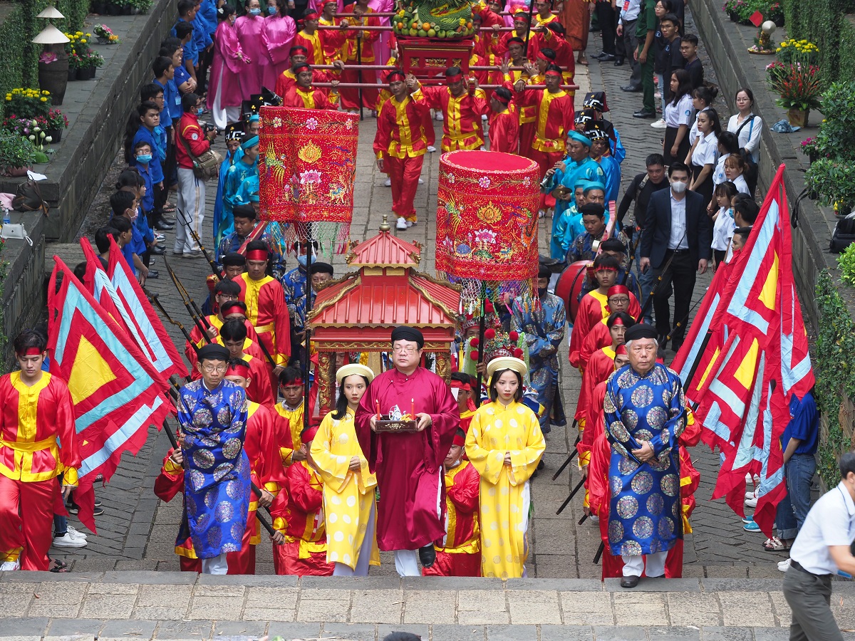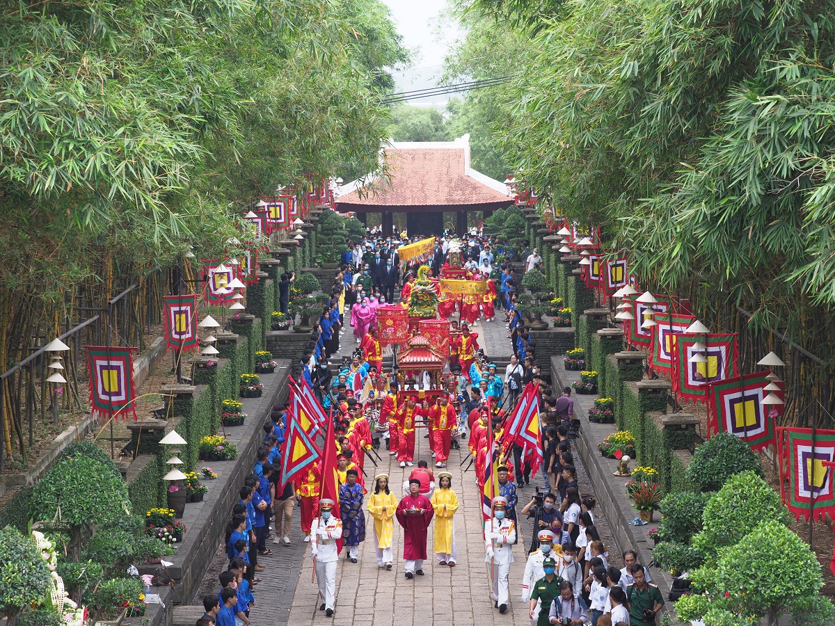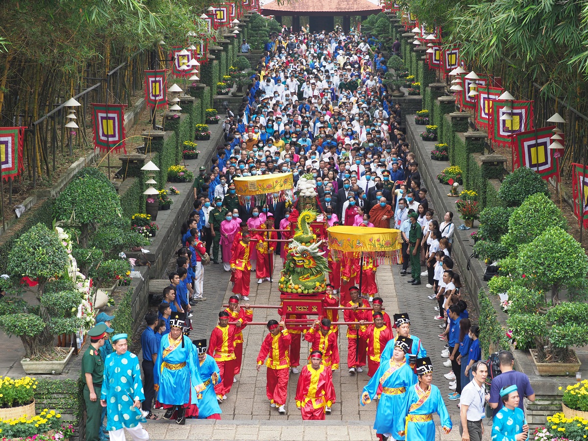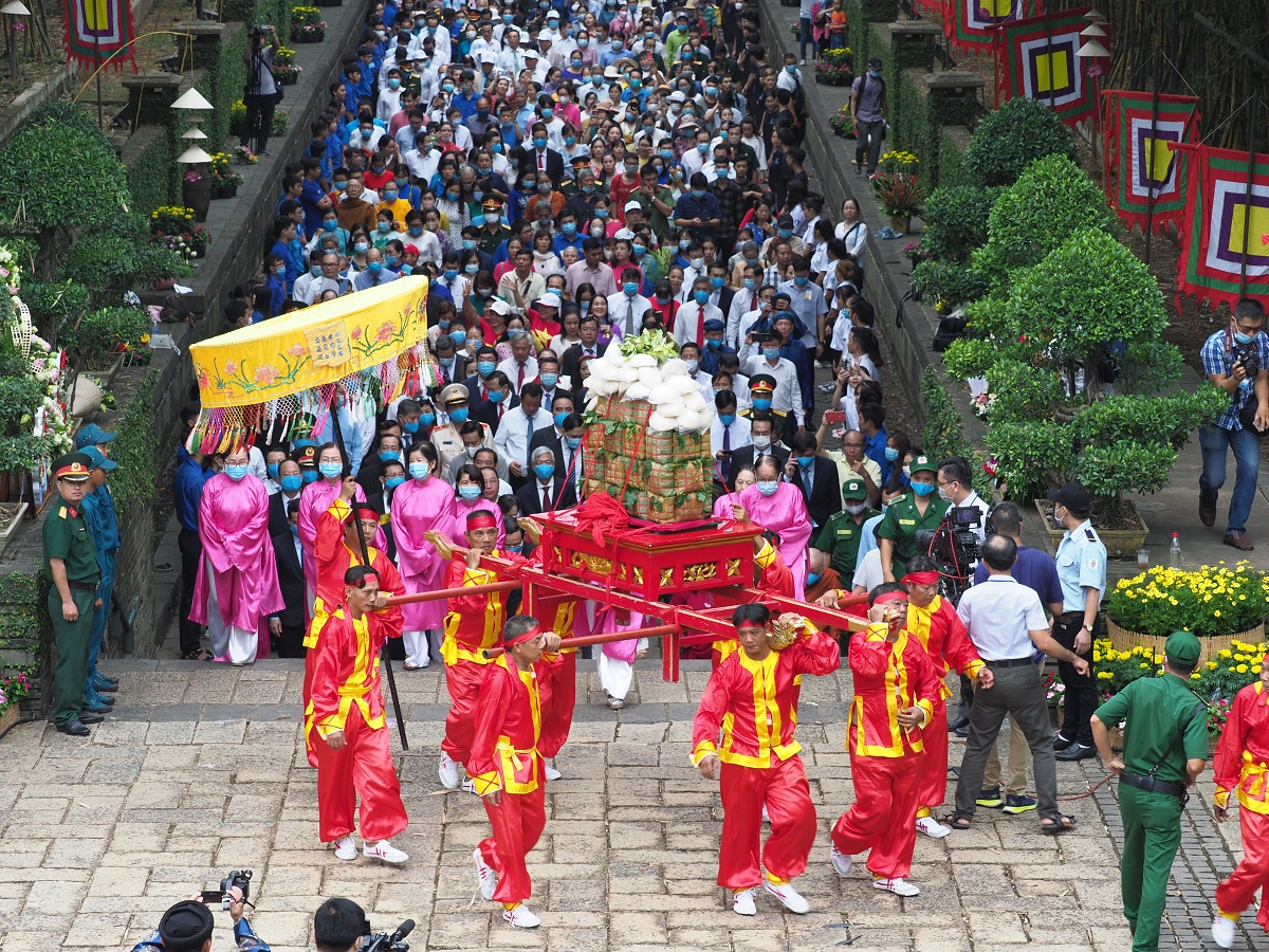 Các đồng chính lãnh đạo, quý khách mời cùng nhân dân thành phố tham gia rước lễ, dâng hương, dâng hoa tại khu Tưởng niệm các vua Hùng thuộc Công viên Lịch sử - Văn hóa Dân tộc (TP Thủ Đức).