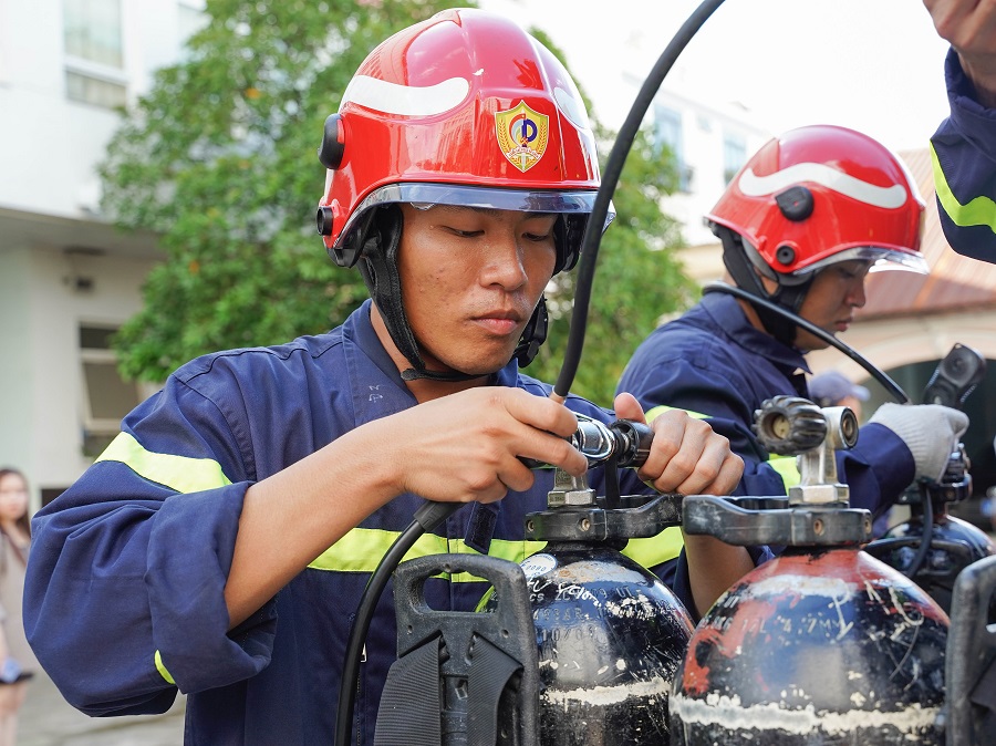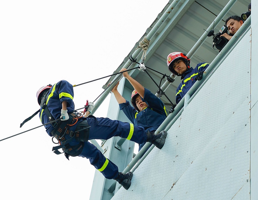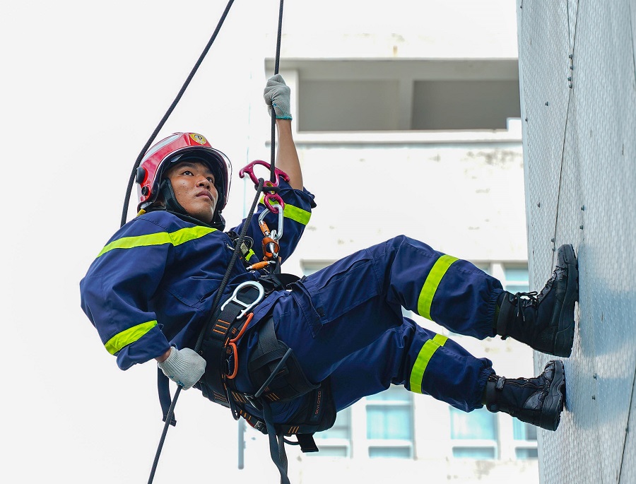 Ghi nhận thực tế quá trình tập luyện của các chiến sĩ PCCC và CNCH (PC07, Công an TP Hồ Chí Minh), tại trụ sở vào chiều ngày 3/10. Các chiến sĩ lần lượt kiểm tra dụng cụ, phương tiện tác chiến, vận hành các thiết bị và thực hiện đu dây từ nhà cao tầng để giải cứu người bị nạn.