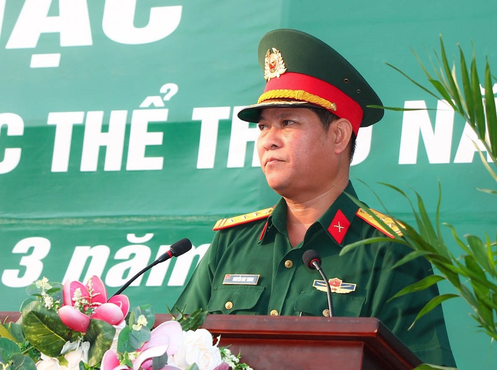Thượng tá Nguyễn Duy Trung - Chỉ huy trưởng Ban chỉ huy Quân sự Quận 3 phát biểu tại lễ khai mạc.