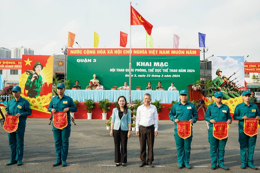 Hội thao quốc phòng, thể dục thể thao Quận 3 năm 2024 diễn ra từ ngày 22/3 với các nội dung thi đấu dành cho vận động viên là cán bộ, chiến sĩ dân quân thường trực Ban CHQS 12 Phường như: Điều lệnh đội ngũ; bắn súng tiểu liên AK bài 1; 5 kỹ thuật băng bó, cấp cứu và chuyển thương hỏa tuyến; ném lựu đạn xa trúng hướng; bơi ứng dụng quân sự; bơi 100m bao gói; bơi 100m vũ trang; bơi cứu hộ, cứu nạn; tiểu đội Dân quân triển khai bố trí một số vật cản trong đô thị...