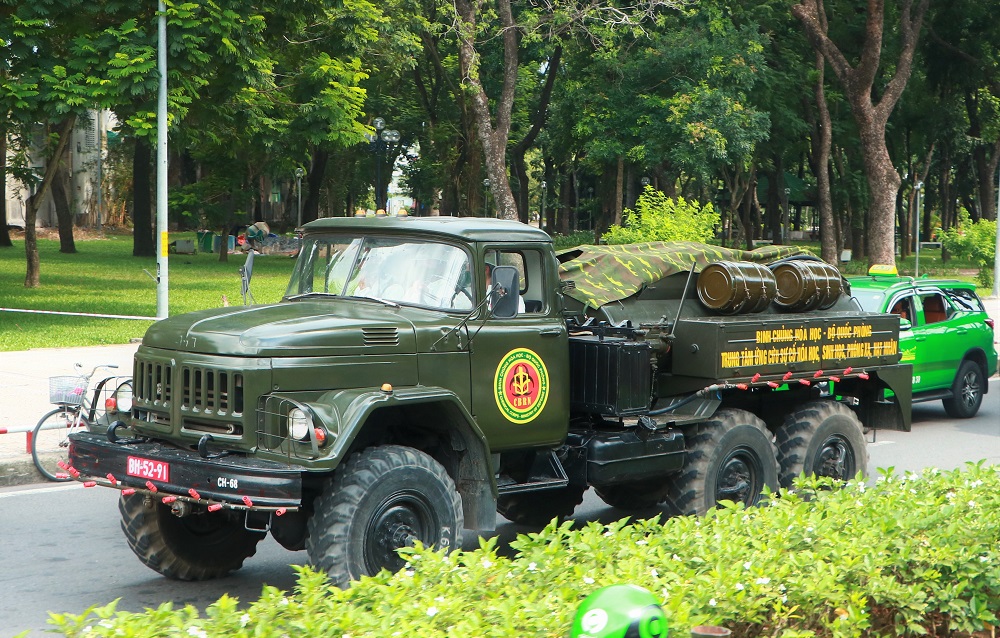Phương tiện vận chuyển nguyên liệu của Lữ đoàn 87, Binh chủng Hóa tham gia thực hiện nhiệm vụ phun khử khuẩn.