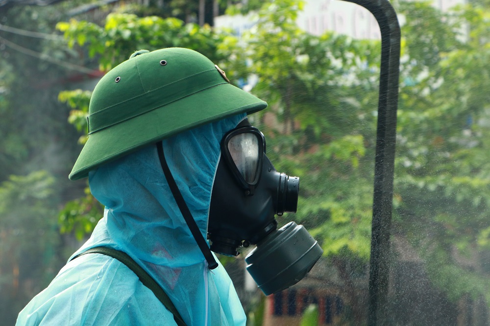 Sau nhiều giờ liền làm nhiệm vụ, hóa chất phủ đầy và làm mờ đi kính mặt nạ chống độc của các chiến sĩ.