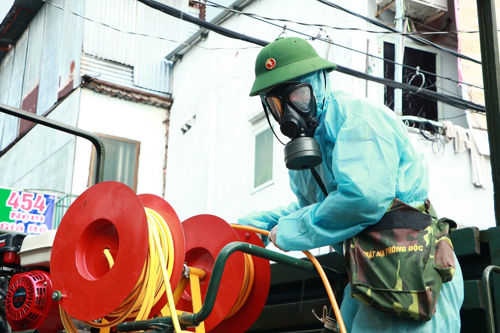 Ngoài phun rửa các trục đường lớn, các con hẻm nhỏ với các bình phun khử khuẩn đa năng các chiến sĩ bộ đội đội hóa học đã đi từng con hẻm để phun xịt khử khuẩn. Ngoài việc phun khử khuẩn, cán bộ, chiến sĩ còn hướng dẫn người dân pha dung dịch Cloramin B để người dân có thể tự tiêu độc, khử trùng tại gia đình.