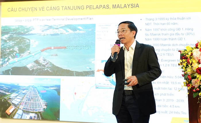 Ông Phạm Anh Tuấn - Tổng Giám đốc Công ty cổ phần Tư vấn Thiết kế cảng - Kỹ thuật biển (Portcoast) trình bày báo cáo tóm tắt về đề án nghiên cứu xây dựng cảng trung chuyển quốc tế Cần Giờ.