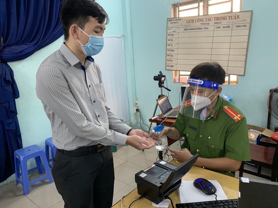 Xịt khử khuẩn trước khi lăn tay cho người dân. Ảnh: CHÍ THẠCH