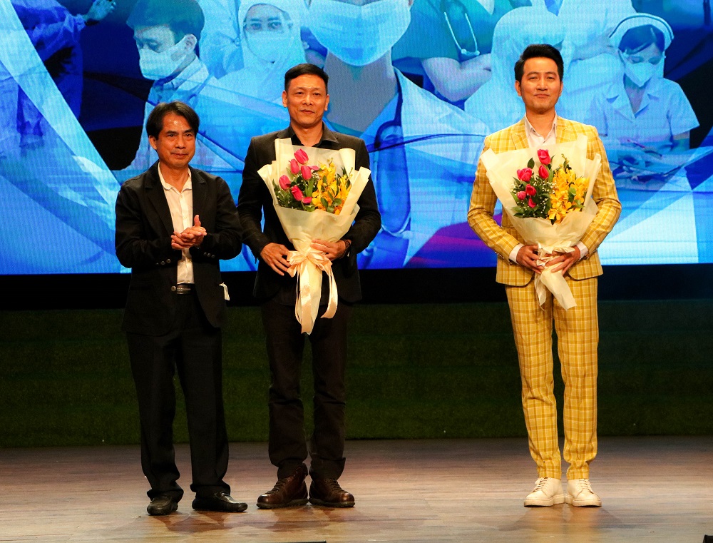 Kiến trúc sư Nguyễn Trường Lưu – Bí thư Đảng đoàn các hội Liên hiệp nghệ thuật Thành phố (bìa trái) trao tặng hoa cho Ca sĩ Nguyễn Phi Hùng (bìa phải), đạo diễn phim Ngô Quang Hải tại chương trình.