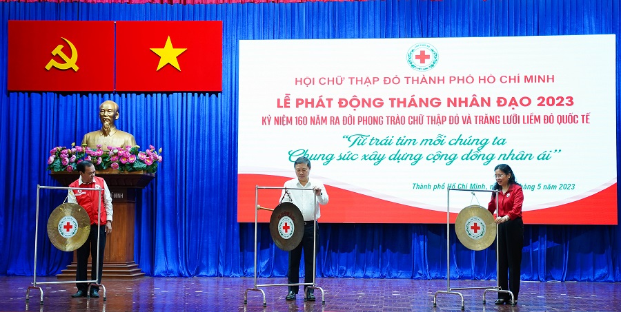 Lãnh đạo Trung ương Hội, TP Hồ Chí Minh, Hội Chữ thập đỏ Thành phố thực hiện nghi thức phát động tháng nhân đạo 2023.