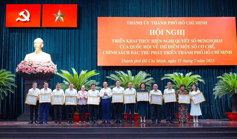 Tại hội nghị, UBND TP Hồ Chí Minh quyết định khen thưởng cho các 39 tập thể, 162 cá nhân có thành tích xuất sắc trong công tác tham mưu, biên soạn và hoàn thành Nghị quyết 98 trình Quốc hội.
