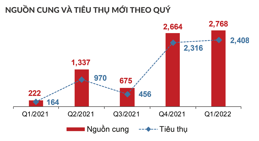 Thị trường căn hộ: ghi nhận 18 dự án mở bán (khoảng 3,398 căn) trong quý vừa qua. Các dự án tiếp tục tập trung chủ yếu tại TP.HCM và Bình Dương. Nguồn cung mới bằng 42% so với Quý 4/2021 (8,039 căn) và bằng 62% so với cùng kỳ năm 2021 (5,515 căn). Lượng tiêu thụ đạt khoảng 2,596 căn, bằng 76% nguồn cung mở bán mới, chỉ bằng 45% so với quý trước (5,767 căn) và bằng 59% so với cùng kỳ năm 2021 (4,416 căn). Riêng tại TP.HCM, nguồn cung sụt giảm đáng kể, trong đó, phân khúc căn hộ hạng B tại khu Tây chiếm vị trí chủ đạo.