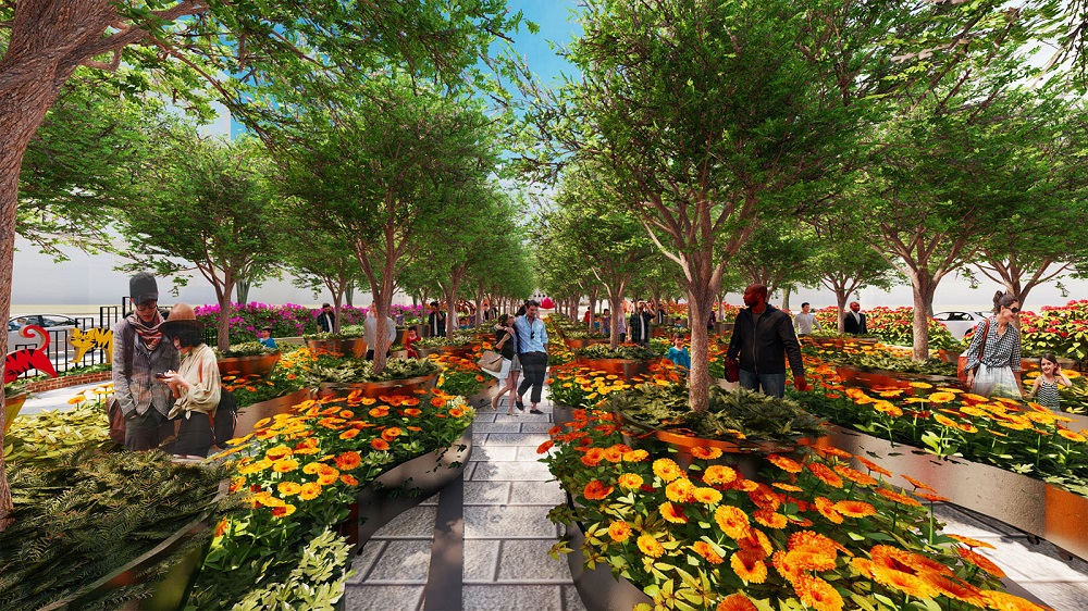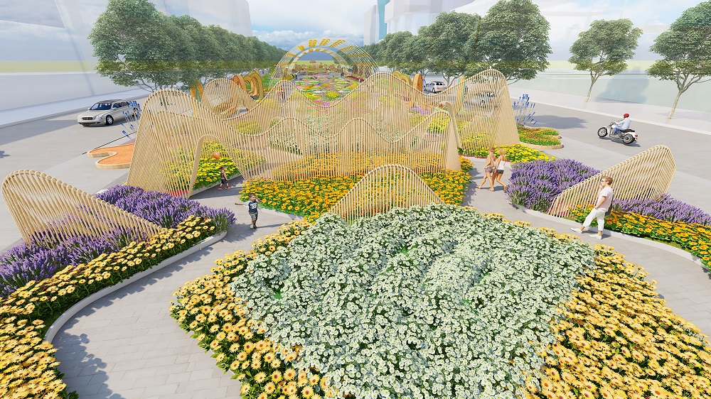 Đường hoa năm nay sử dụng 12 màn hình Led được bố trí trên các trụ cao khoảng 4m, tạo thành vòng tròn diện tích khoảng 140m2, bên trên là bông hoa lớn 4 màu được kết bởi các sợi dây đan dài 15m chạy dọc theo hệ thống cáp và sợi cước. Ban ngày, bông hoa có tính năng trang trí cảnh sắc, tạo bóng râm để khách tham quan có thể xem những thước phim về cuộc chiến chống dịch của thành phố. Ban đêm, bông hoa đảm nhận thêm nhiệm vụ hỗ trợ chiếu sáng bằng hệ thống đèn Led chạy dọc theo kết cấu.