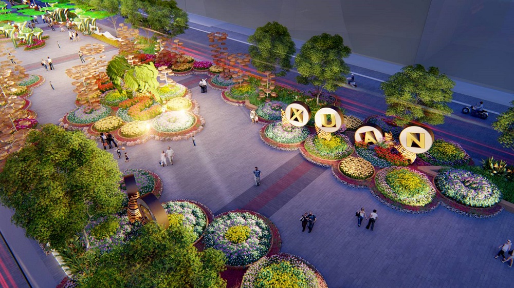 Tổng quan thiết kế đường hoa Nguyễn Huệ năm 2022 với phối cảnh tại lối vào là hình tượng "Song Hổ trùng phùng".