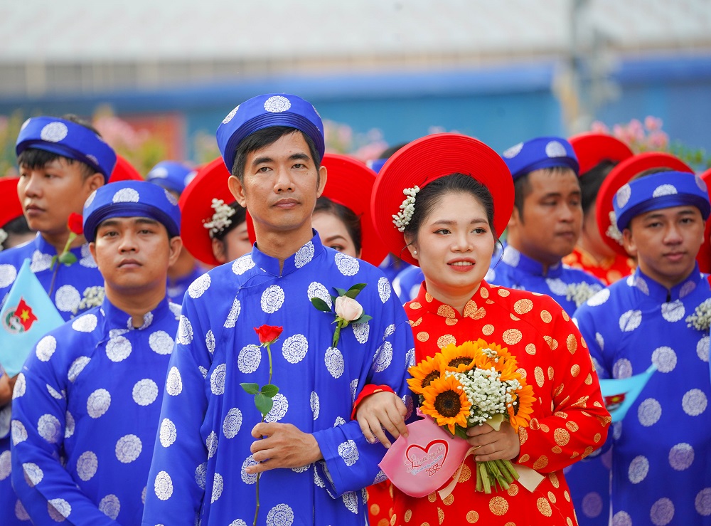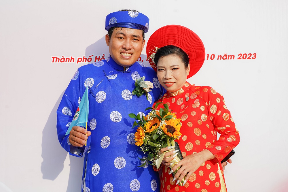 "Hai vợ chồng ngày trước đi làm công nhân ở Bình Dương, cùng công ty nên quen biết và tiến tới tìm hiểu. Hai vợ chồng đã kết hôn đã 10 năm vẫn chưa có điều kiện để tổ chức được lễ cưới. Cũng nhờ các anh chị hỗ trợ đăng ký tham gia chương trình để có một lễ cưới tập thể cùng các cặp đôi khác. Thật sự hôm nay cảm thấy rất hạnh phúc, mình được tổ chức và tham dự một lễ cưới tập thể với quy mô tổ lớn, đông vui và rất ý nghĩa..." - Chú rể Bùi Thanh Thuận chia sẻ.