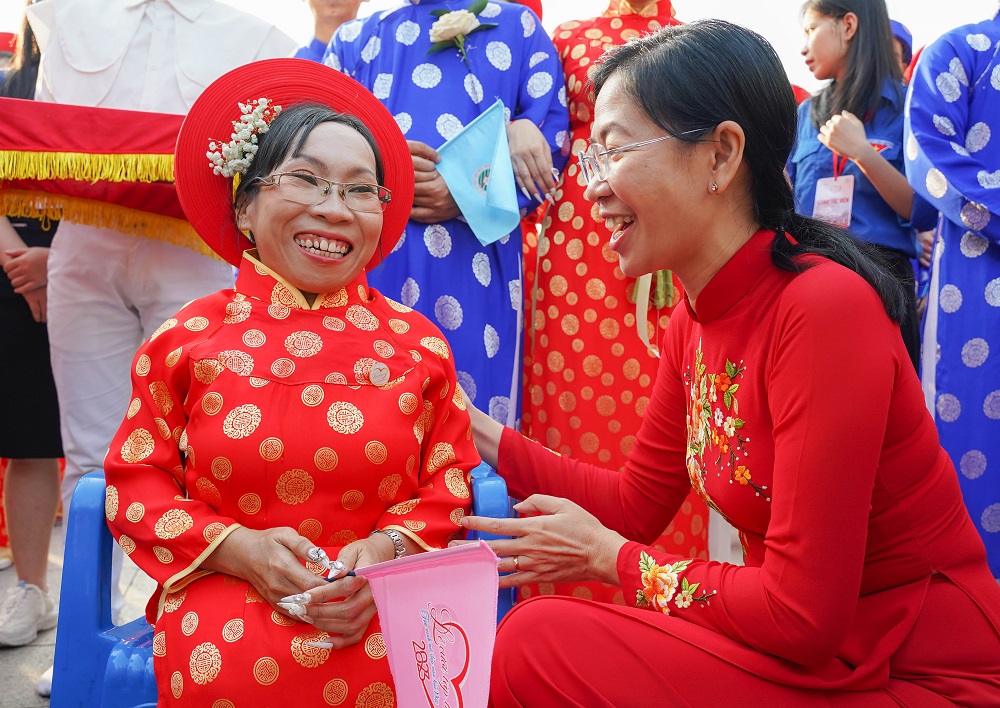 Bí thư Thành đoàn TP Hồ Chí Minh Phan Thị Thanh Phương Phương Thảo gửi lời động viên đến cô dâu Nguyễn Thị Là (Bình Dương).