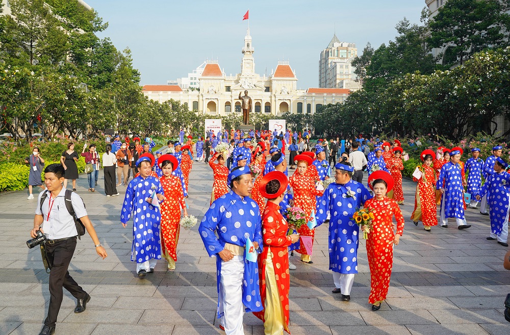 Ngay từ sáng sớm, các cặp đôi đã có mặt ở Phố đi bộ Nguyễn Huệ (Quận 1), thực hiện lễ dâng hoa tượng đài Chủ tịch Hồ Chí Minh.