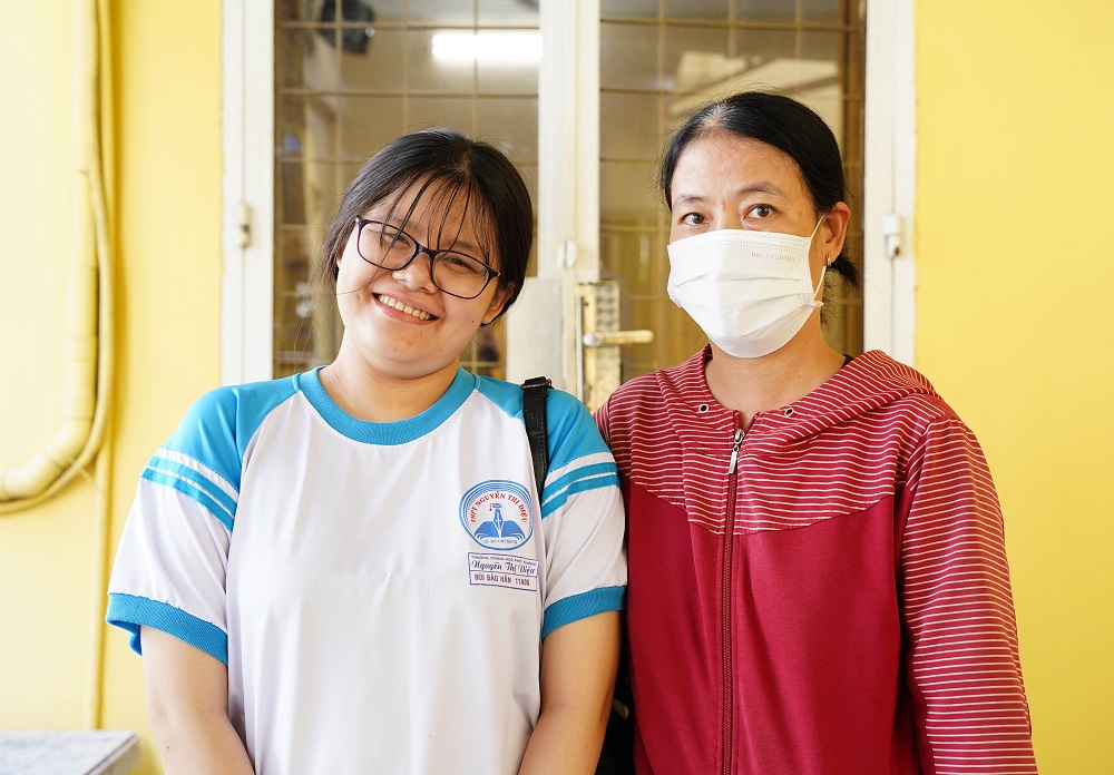 Em Bùi Nguyễn Bảo Hân, học sinh lớp 12A4, Trường THPT Nguyễn Thị Diệu, hạnh phúc cùng chị Nguyễn Thị Hạnh (mẹ Bảo Hân) khi nhận được hỗ trợ.