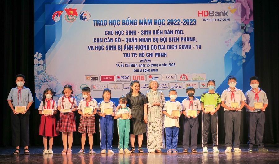 Nguyên Phó chủ tịch nước Trương Mỹ Hoa cùng đại diện lãnh đạo Thành đoàn TP Hồ Chí Minh trao tặng học bổng đến các học sinh.