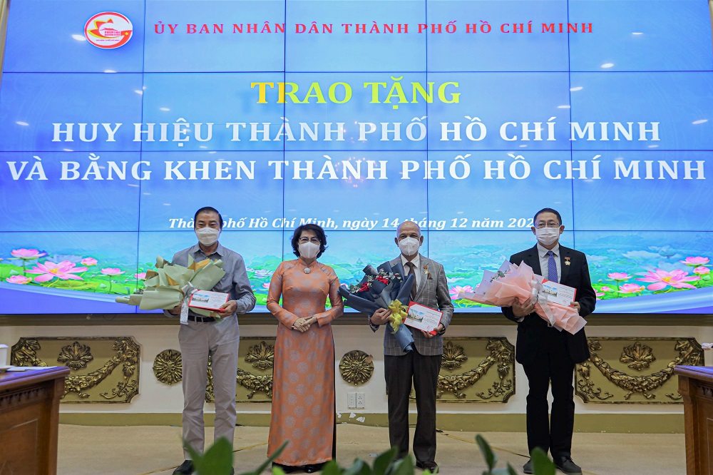 Đồng chí Tô Thị Bích Châu - Chủ tịch UB MTTQ Việt Nam TP.HCM (thứ 2 từ trái sang) trao tặng Huy hiệu Thành phố Hồ Chí Minh cho một các đại biểu người Việt Nam ở nước ngoài đã có nhiều đóng góp quan trọng cho Thành phố.