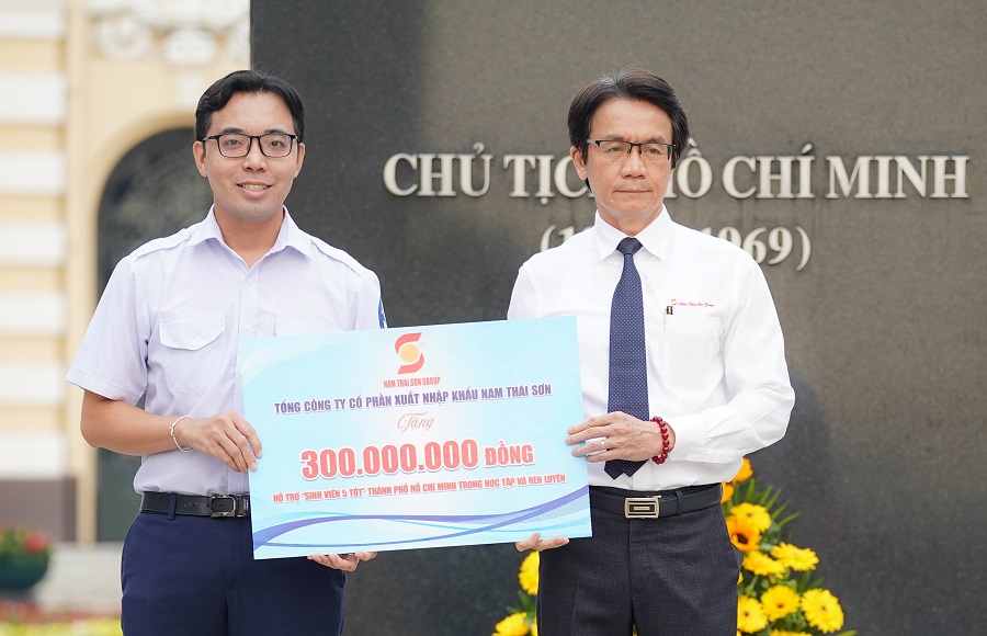 Nhân chương trình, ông Trần Việt Anh - Tổng giám đốc Tổng công ty cổ phần Xuất nhập khẩu Nam Thái Sơn (phía phải) đã trao 300.000.000 đồng tiền mặt hỗ trợ sinh viên 5 tốt TP Hồ Chí Minh trong học tập.