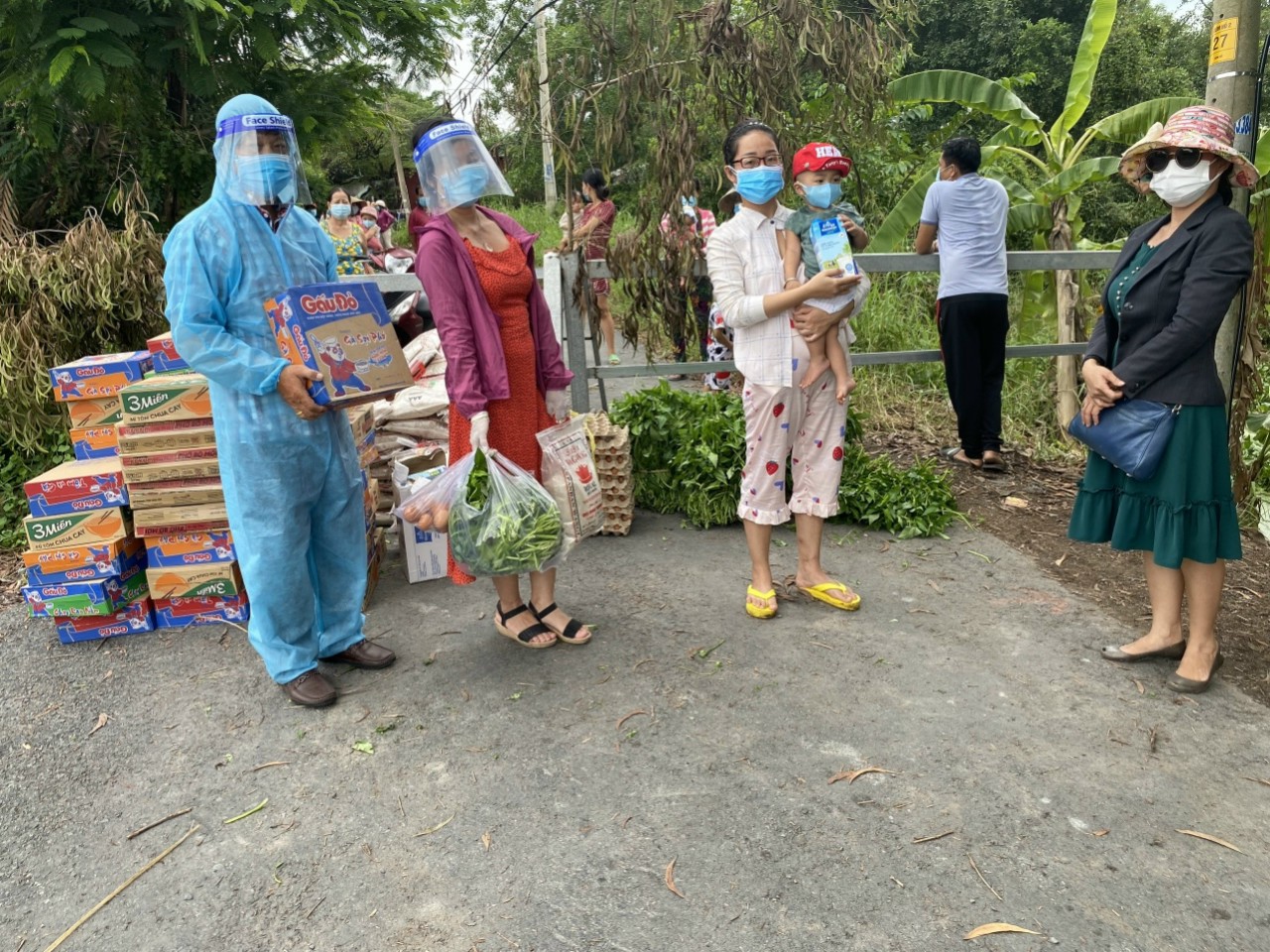 Anh Lưu Quốc Cường (mặc quần áo bảo hộ) chuẩn bị các phần quà trao tặng người dân