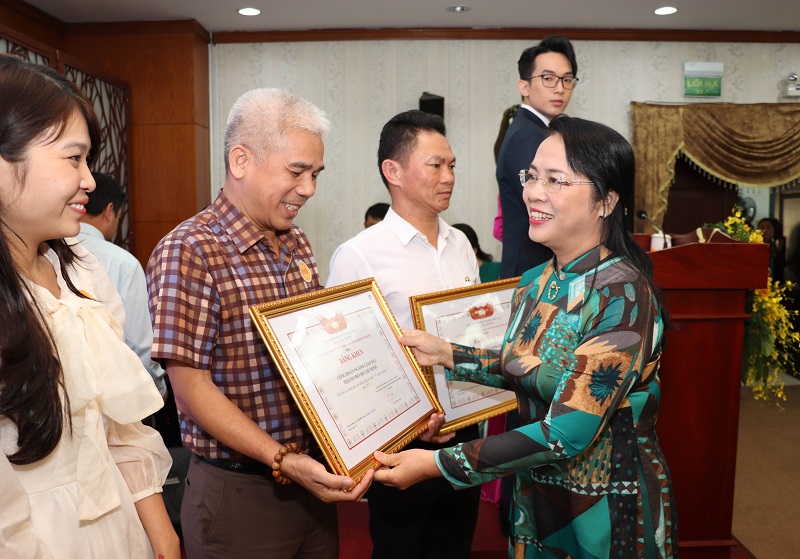 Chủ tịch MTTQVN TP Hồ Chí Minh Trần Kim Yến trao bằng khen đến các cá nhân, tập thể đã có đóng góp kết quả hoạt động trong năm 2022.