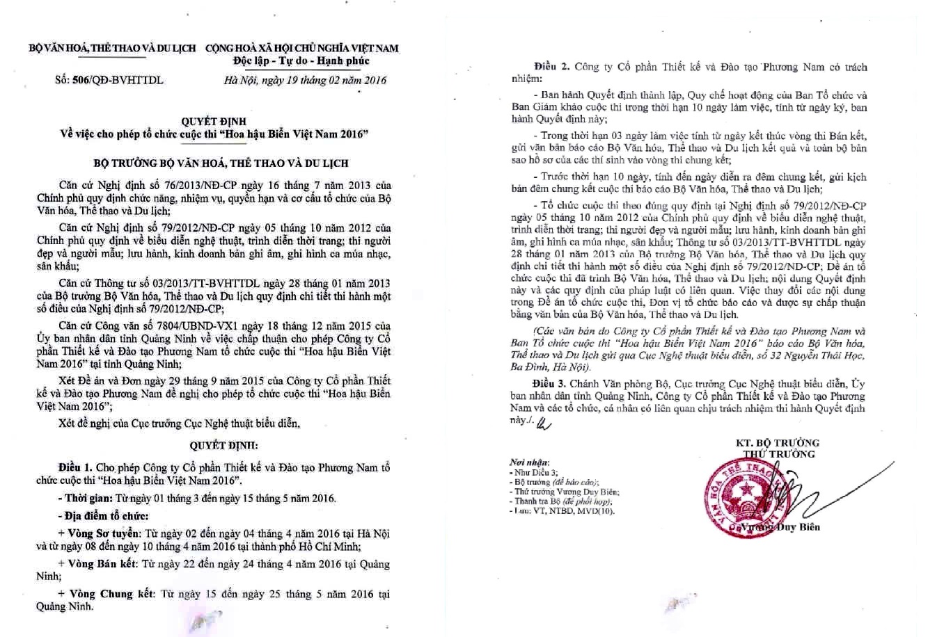 Giấy phép Bộ Văn hóa Thể thao và Du lịch cấp cho Công ty Cổ phần Thiết kế và Đào tạo Phương Nam về tổ chức Cuộc thi hoa hậu Biển Việt Nam 2016