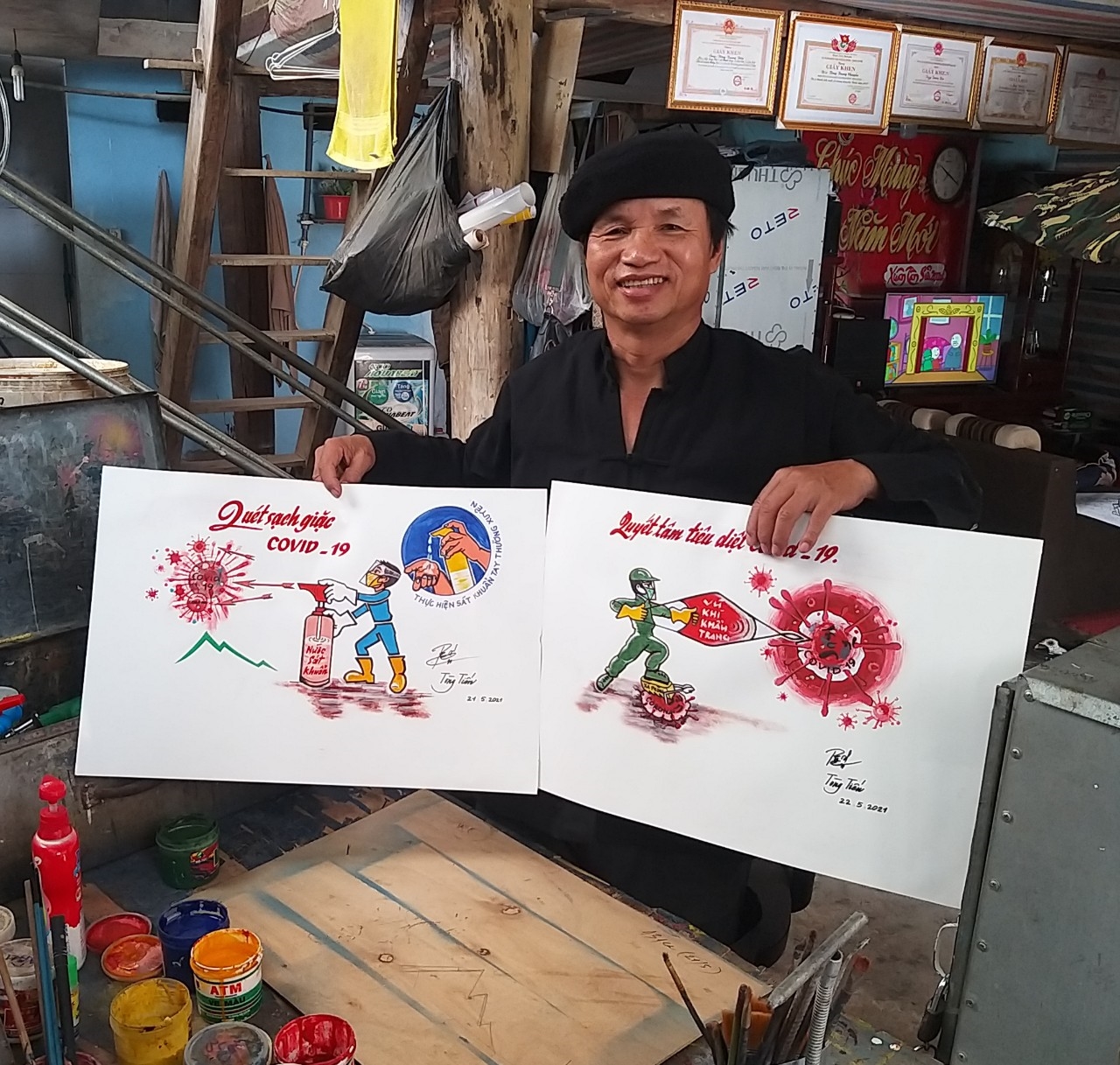 Năm nay, người cựu binh này đã ngoài 60 tuổi, nhưng ông vẫn luôn nhiệt tình, tâm huyết với việc xã hội, cộng đồng. Với kinh nghiệm từng làm công tác tuyên huấn, để góp phần hiệu quả công tác phòng chống đại dịch Covid-19, ông đã vẽ rất nhiều tranh cổ động, pano, khẩu hiệu để phục vụ cho công tác tuyên truyền phòng chống covid-19-19.