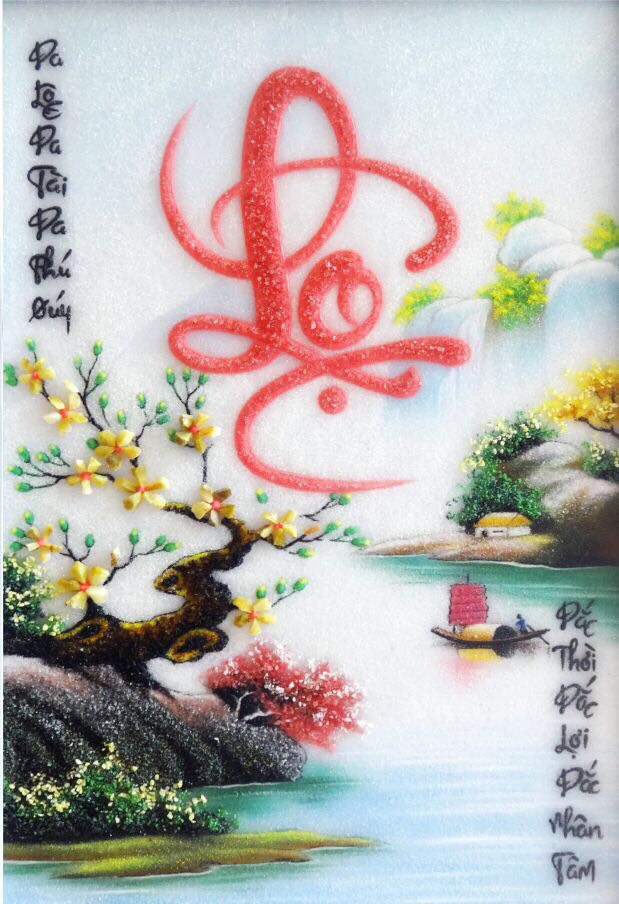 Bên cạnh đó còn có Tranh đá quý chữ thư pháp. Từ xưa, khi Tết đến, mọi người vẫn thường đến cụ đồ để xin chữ. Vào đầu năm mới, bức tranh nghệ thuật thư pháp thường được treo hoặc dán vào những nơi trang trọng trong nhà. Về mặt phong thủy, treo tranh đá quý chữ thư pháp trong nhà sẽ đem lại nhiều điều may mắn trong năm mới.