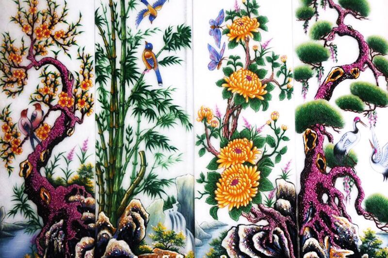 Tranh đá quý tứ quý Xuân Hạ Thu Đông với mỗi bức là một loại cây khác nhau. Bên góc phải là cây tùng nó tượng trưng cho sự nghên đón khách, mời chào khách, nói lên gia chủ là một người rất hiếu khách. Kế tiếp là cây hoa mai, hoa mai như một biếu tượng của ngày tết, báo hiệu những điều may mắn thiện lành, là biểu trưng cho sự no ấm hạnh phúc của gia chủ. Kế tiếp là hoa cúc vàng tượng trưng cho khí tiết kiên chung của người quân tử, trong phong thủy nói chung hoa cúc vàng là biểu tượng của sự sống, tăng thêm phúc lộc và niềm vui. Kế tiếp là hình ảnh cây tre,cây trúc đã là người Việt Nam không thể ai không nhắc tới hình ảnh cây tre, chúng được đưa vào sách vở, báo trí, hay cả những bộ phim, tre mang ý nghĩa của sự sống mãnh liệt, dù cho có khô cằn cỗi tới đâu thì tre vẫn đứng thẳng không chịu cúi đầu vẫn vươn mình chống trọi với thiên nhiên. Bức tranh với ngụ ý mong muốn cho gia chủ trước tiên là luôn luôn có sức khỏe dồi dào, công việc làm ăn thì luôn phát đạt, tiền tài phú quý.