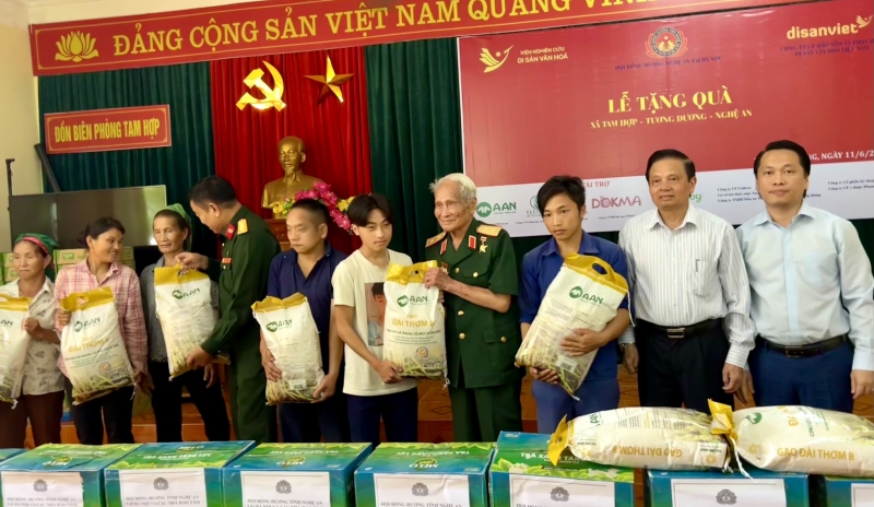 Nguyên Bộ trưởng Lê Doãn Hợp và Đ/c Nguyễn Văn Hùng - Chủ tịch HĐQL, Phó Viện trưởng Viện Nghiên cứu Di sản Văn hoá trao quà tại Đồn biên phòng Tam Hợp.