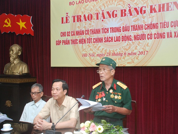 Thay mặt Hội đông thi đua khen thưởng của Bộ, Chánh Văn phòng Bộ LĐ-TB&XH Nguyên Bá Hoan đã công bố Quyết định của Bộ cho hai ông Nguyễn Tiến Lãng (sinh năm 1938, cư trú tại phố Tam Á, xã Gia Đông, huyện Thuận Thành, Bắc Ninh) và Nguyễn Công Uẩn (sinh năm 1937, cư trú tại thôn Bùi Xã, xã Ngũ Thái, huyện Thuận Thành, Bắc Ninh) do có thành tích trong đấu tranh chống tiêu cực, góp phần thực hiện tốt chính sách lao động, người có công và xã hội.