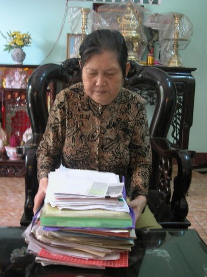 | Cụ Mai Thị Hoàng (mẹ TB ¼ Diệp Kim Thạch) bên chồng hồ sơ khiếu kiện, đã qua đời tháng 5/2014, song đến nay vụ việc vẫn chưa có kết quả. |