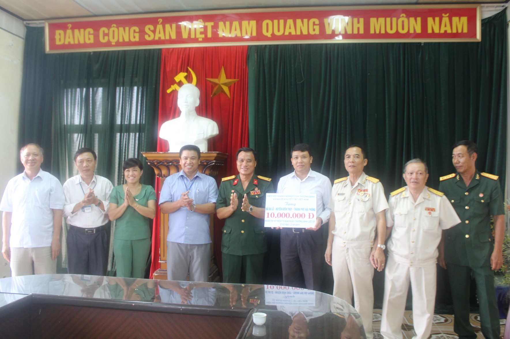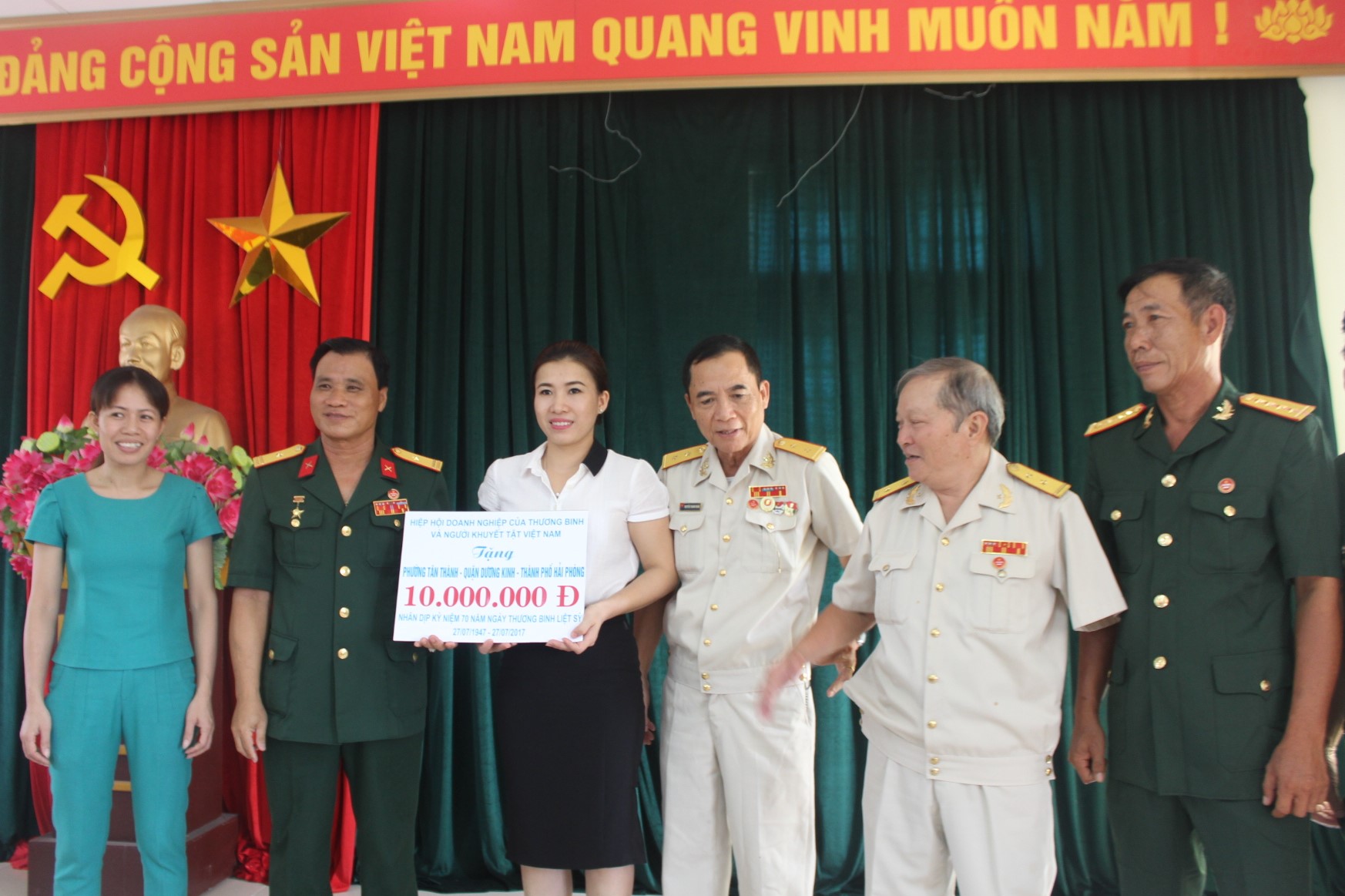 HOANHAP.VN - Thực hiện theo chủ trương, chính sách, pháp luật của Đảng và nhà nước với truyền thống “uống nước nhớ nguồn”, tri ân công lao của những người có công với quê hương đất nước, ngày 17/7, nhân kỷ niệm 70 năm Ngày Thương binh liệt sỹ, Đại diện Lãnh đạo Hiệp hội Doanh nghiệp của Thương binh và Người khuyết tật Việt Nam tại Hải Phòng đã tổ chức trao quà cho các thành viên là thương bệnh binh, gia đình chính sách và trẻ em nhiễm chất độc màu da cam trên địa bàn phường Tân Thành, Hải Thành quận Dương Kinh, xã Du Lễ huyện Kiến Thụy, thành phố Hải Phòng, với tổng giá trị món quà là 30 triệu đồng.
