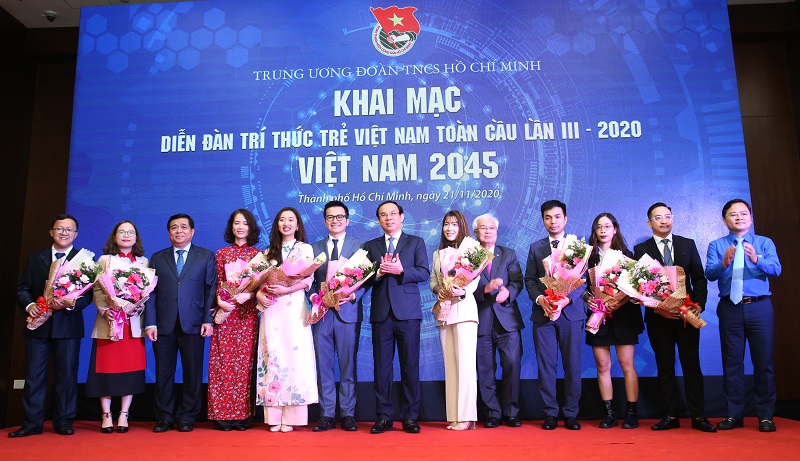 Lãnh đạo Bộ, ban, ngành Trung ương tặng hoa các anh, chị đại diện tham dự Diễn đàn Trí thức trẻ Việt Nam toàn cầu lần thứ III, năm 2020.