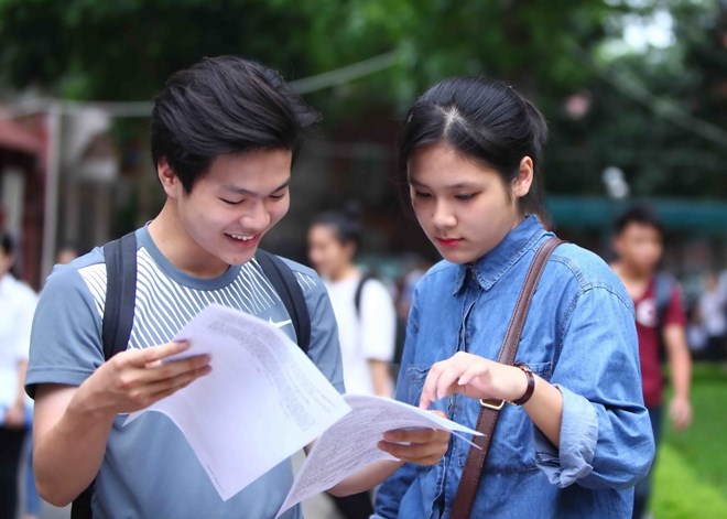 Thí sinh trao đổi bài sau khi kết thúc môn thi cuối của kỳ thi Trung học phổ thông Quốc gia năm 2016 tại cụm thi Trường Đại học Thủy Lợi. (Ảnh: Quý Trung/TTXVN)