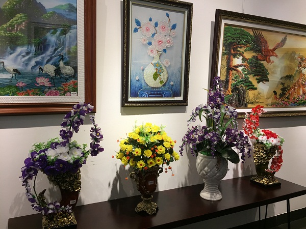 Sau rất nhiều nỗ lực, triển lãm về sản phẩm của chị Hòa lần đầu tiên đã được thực hiện dưới sự hỗ trợ của nhiều nhà hảo tâm. Triển lãm các tác phẩm hoa đá, tranh đính đá của chị đang diễn ra ở Nguyen Art Gellery, 31A Văn Miếu, Hà Nội.