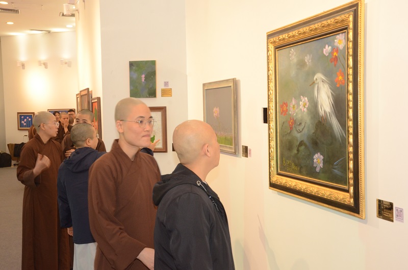 Các vị sư thầy thưởng lãm, chiêm nghiệm những bức tranh họa tại buổi triển lãm.