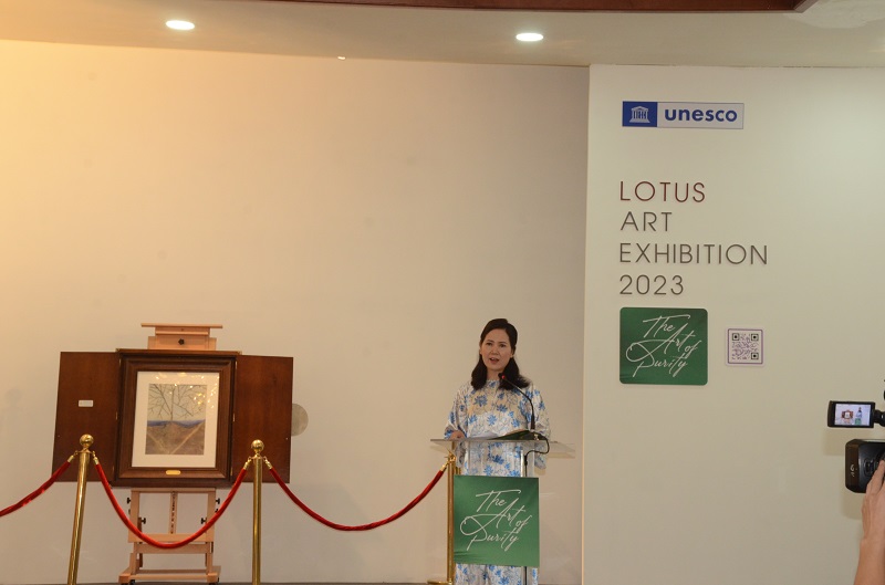Họa sĩ Nguyễn Thị Kim Đức phát biểu chia sẻ tại lễ khai mạc Triển lãm nghệ thuật “Sen Việt 2023 - Vẻ đẹp thuần khiết”.
