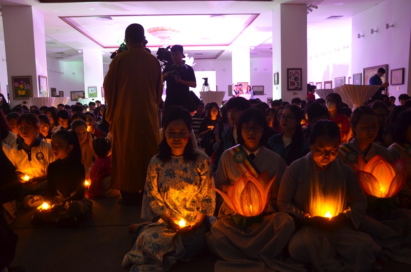 Đồng thời, cuối chương trình, các vị quan khách và hàng trăm đoàn viên thanh niên, các em học sinh - sinh viên đã cùng tắt điện và thắp nến để hưởng ứng Giờ Trái đất, trong không khí linh thiêng tràn đầy đạo vị Phật giáo.