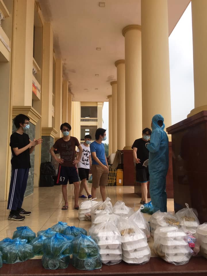 Các cư dân trong khu cách ly dịch virus ở Sơn Tây nhận các suất cơm để đưa về phòng ở của mình.