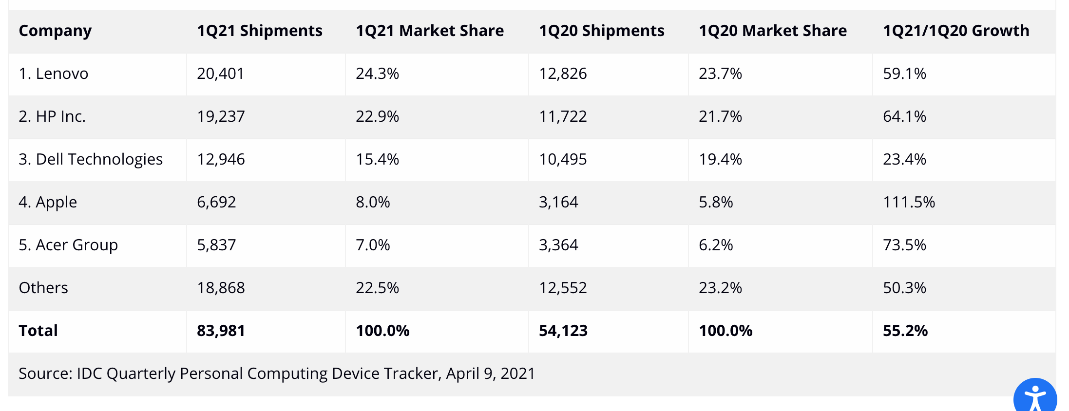 Mới đây, IDC đã công bố số lượng PC xuất xưởng trong quý 1, tăng 55,2% so với cùng kỳ năm ngoái. Đây là mức tăng trưởng cao kinh ngạc.