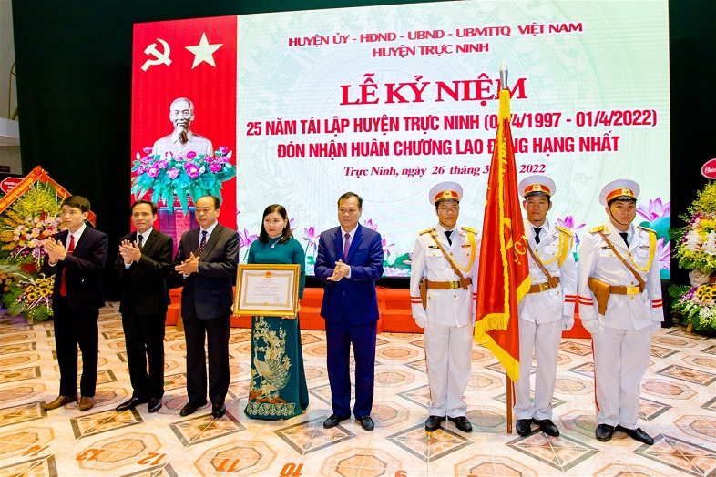 Đồng chí Lê Quốc Chỉnh - Phó Bí thư Thường trực Tỉnh ủy trao Huân chương Lao động hạng Nhất của Chủ tịch nước cho Đảng bộ, chính quyền và nhân dân huyện Trực Ninh. (Ảnh: TT Trực Ninh-Nam Định)