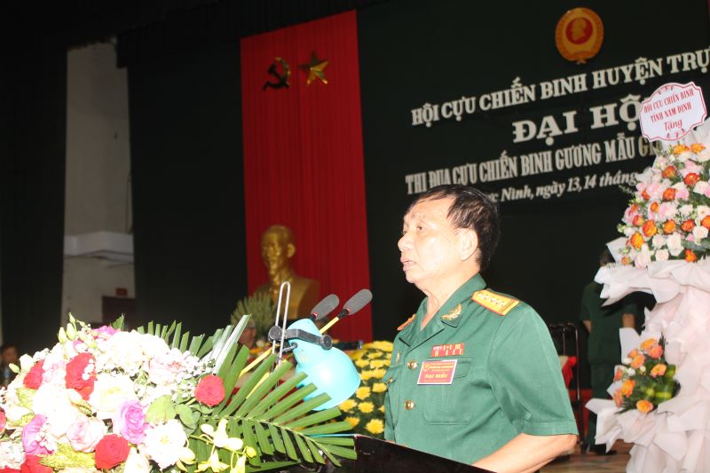 Đại tá Lê Xuân Thu, Phó Chủ tịch Thường trực Hội CCB tỉnh Nam Định phát biểu chỉ đạo tại đại hội và trao tặng Hội CCB huyện Trực Ninh lẵng hoa tươi thắm - Ảnh: Hồ Thanh