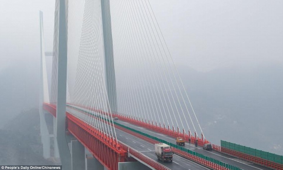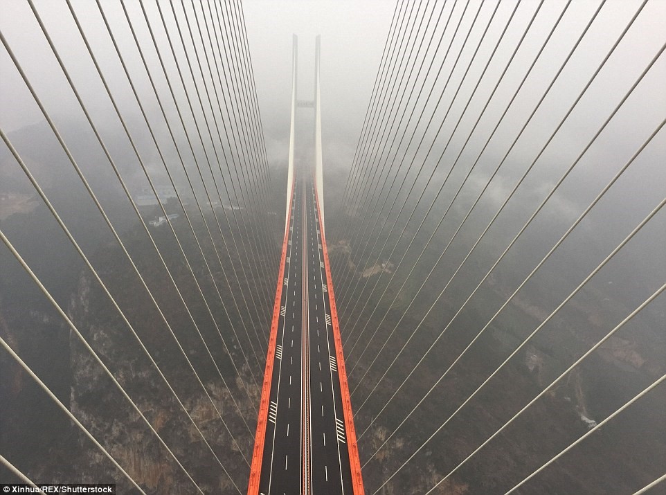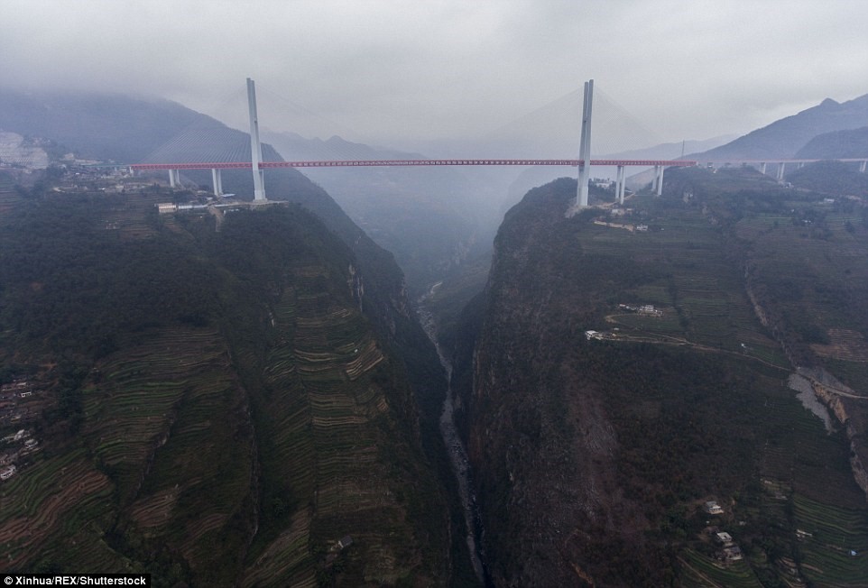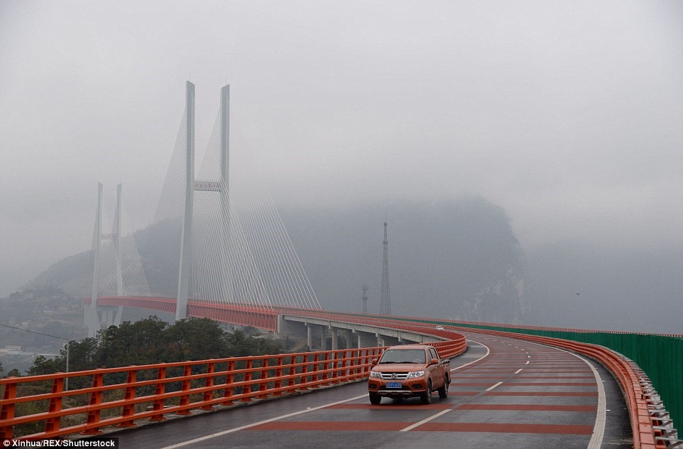 Cây cầu có tên Bắc Bàn Giang, cao 565 m, dài 1.340 m bắc qua một khe núi nối hai tỉnh Vân Nam và Quý Châu, Trung Quốc. Ảnh: Xinhua/Rex/Shutterstock.