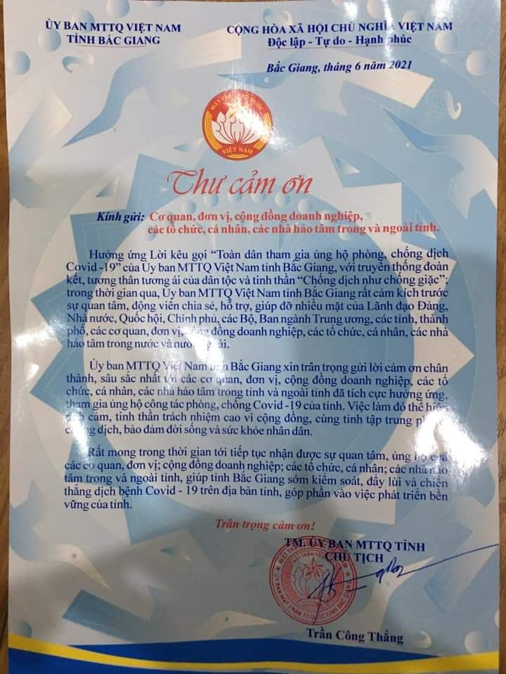 Thư cảm ơn của UBMT Tổ quốc tỉnh Bắc Giang tri ân các đơn vị, tổ chức đã ủng hộ Bắc Giang trong công tác phòng chống dịch Covid 19