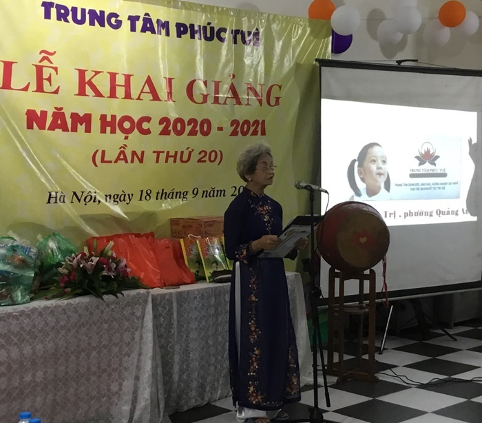 Bà Vũ Thị Minh Hương, Giám đốc Trung tâm Phúc Tuệ phát biểu khai giảng năm học mới 2020-2021