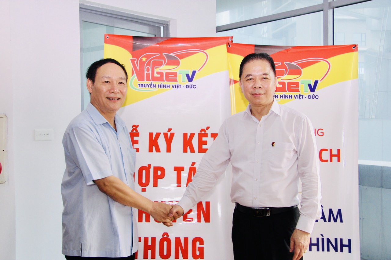 Nhà báo Nguyễn Trọng Thắng (đứng bên phải) Giám đốc Trung tâm Truyền hình Việt-Đức và Lãnh đạo và Viện nghiên cứu Ứng dụng phong thủy Việt Nam tại buổi ký kết.